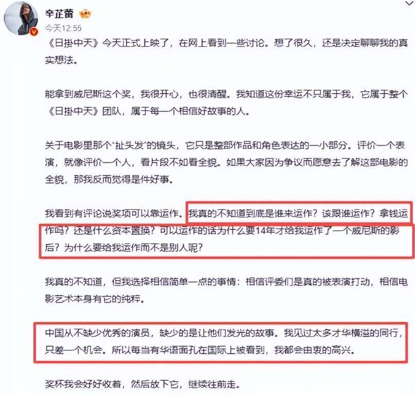 然后辛芷蕾又回应“拿奖运作”这个争议。