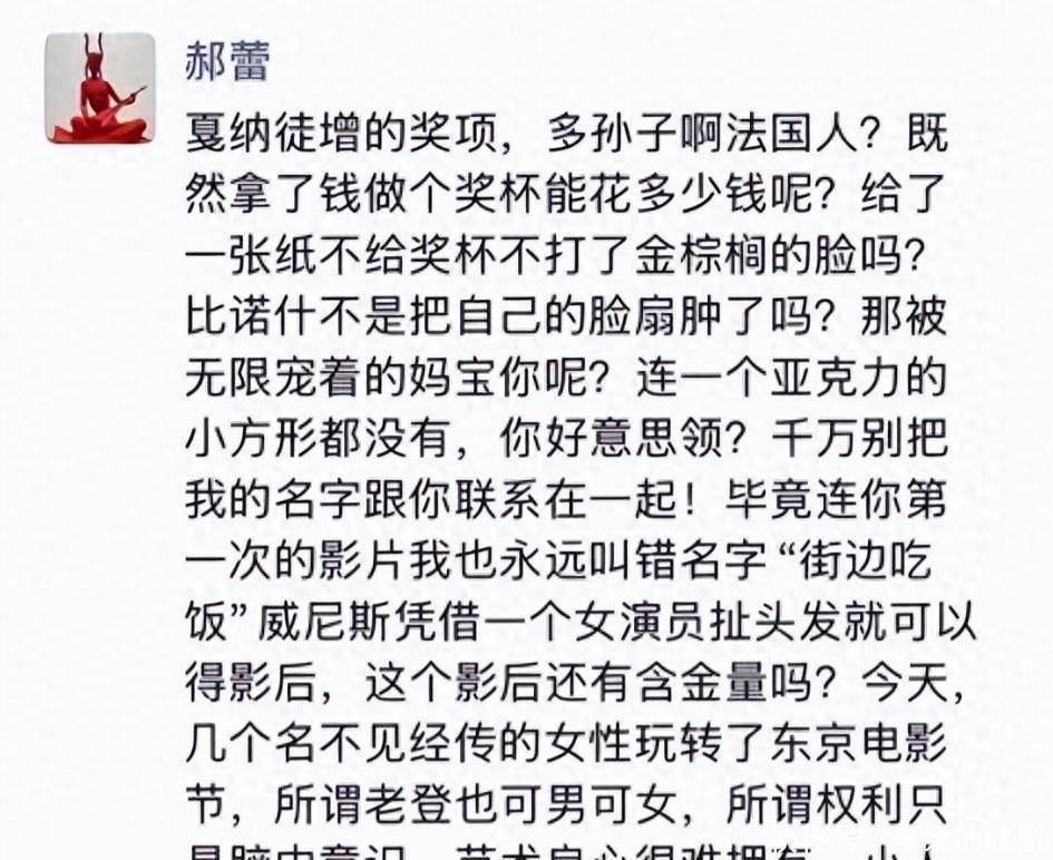都是中国女演员,没有必要这么针对,辛芷蕾能获得这个奖,不仅是国外评委的认可,更多的是她自己努力多年的成果,这是她应得的。 至于郝蕾的那条朋友圈,不是她发的还好。 要是真是本人发的,小编觉得实在没必要,这波显得自己那么的没格局。 对此你怎么看?